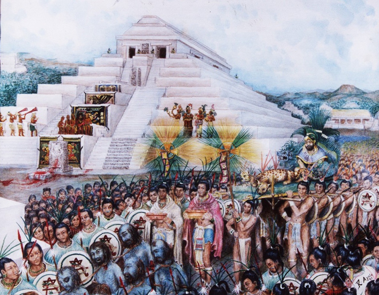 Esta obra presenta un desfile o procesión conduciendo a un grupo de prisioneros españoles hacia el sitio para ser inmolados en el altar de sacrificios, los cautivos están preparados según la costumbre para ser recibidos y conducidos por el dios para el más allá, el color azul de su piel y la expresión de sus rostros, sugieren estar drogados. Detrás de ellos dos Chilán “sacerdotes” portan incensarios posiblemente para disimular el hedor de los españoles.